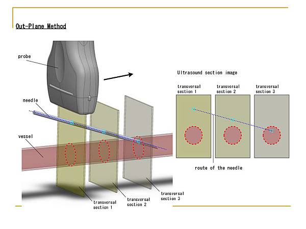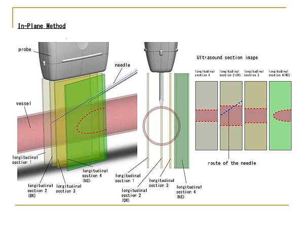 同時顯示橫/縱切面影像,執行PICC,CVC時正確抓到血管位置避開各神經。
